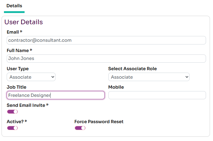 An associate user is a regular user that has limited access to the system but is only charged for months that are active. Because an Associate user has limited functioinality then the license fee is reduced. An associate user is generally a contract or freelance user or event a third party supplier that you want to manage as a resource on one or more projects. An associate user can manage their leave, tasks, expenses and schedule but has limited access to other people's data. They only have access to projects to which they are assigned.
