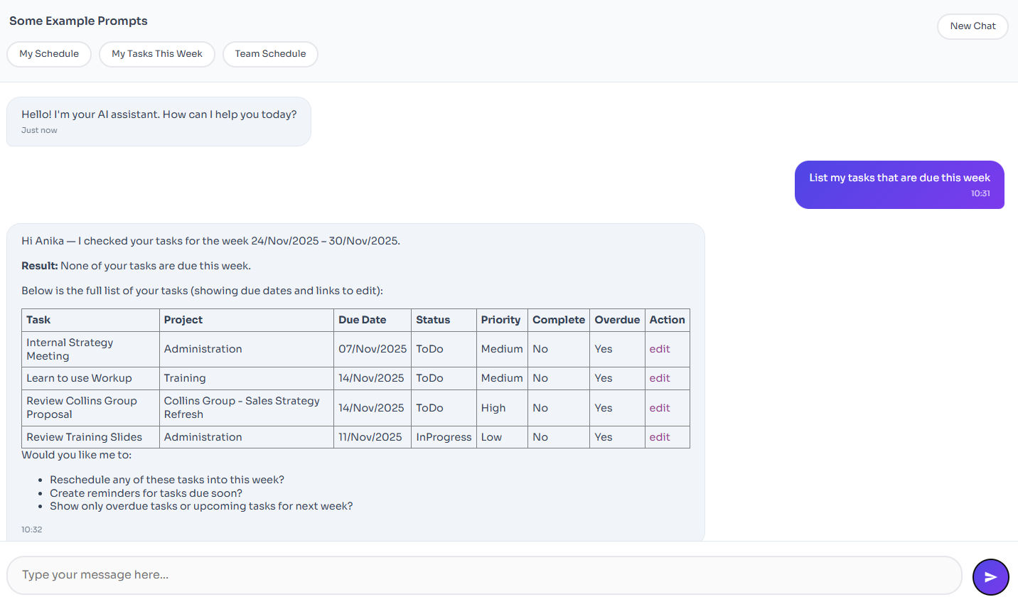 The AI Assistant has secure access to a wide range of your data held within Workup, so you can ask it both simple and complex questions on people, tasks, leave, schedules and projects. Some useful, potential prompts are below: